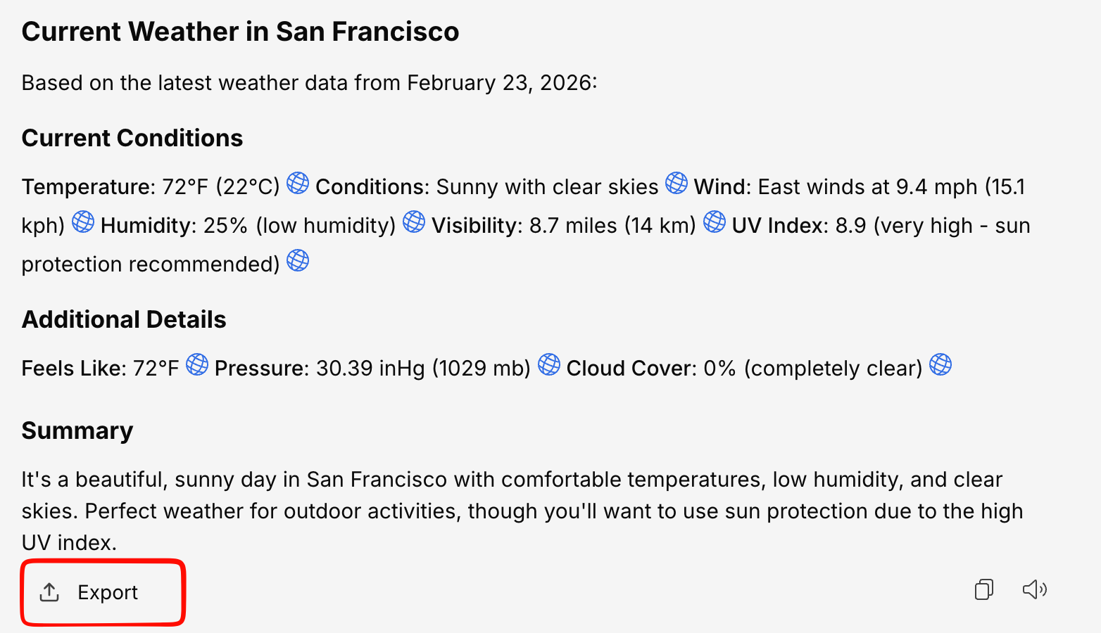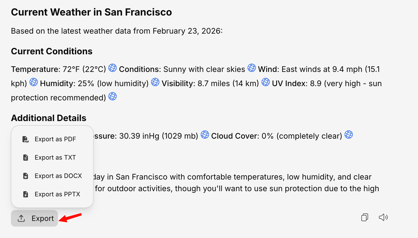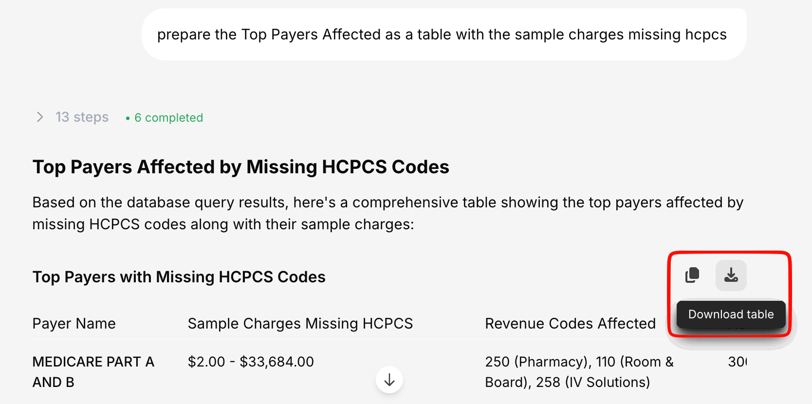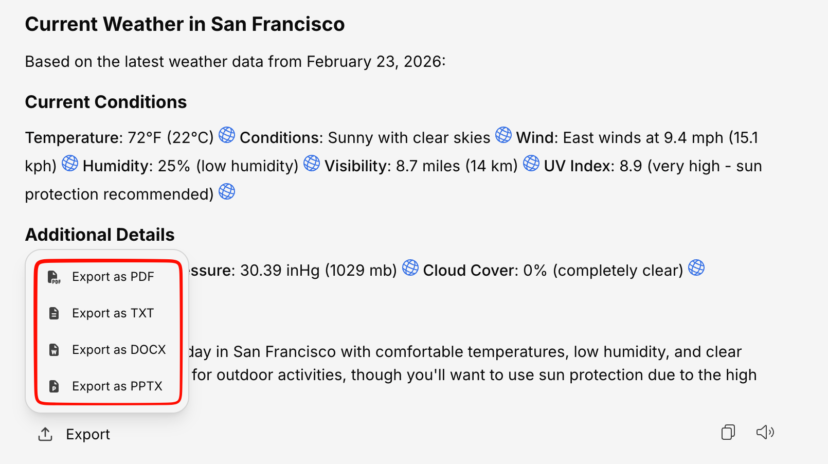 When a conversation contains tables (e.g., data from a database query or a structured response), you can export individual tables separately:- CSV — Comma-separated values for spreadsheet tools