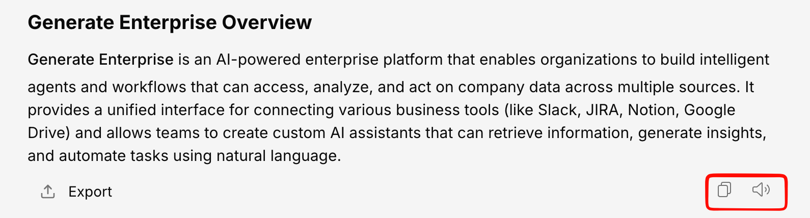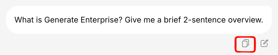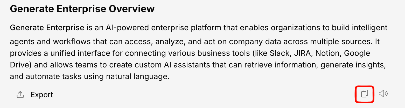 Click the copy icon to copy the full AI response to your clipboard. The copy preserves:- Text formatting (bold, italic, headings)