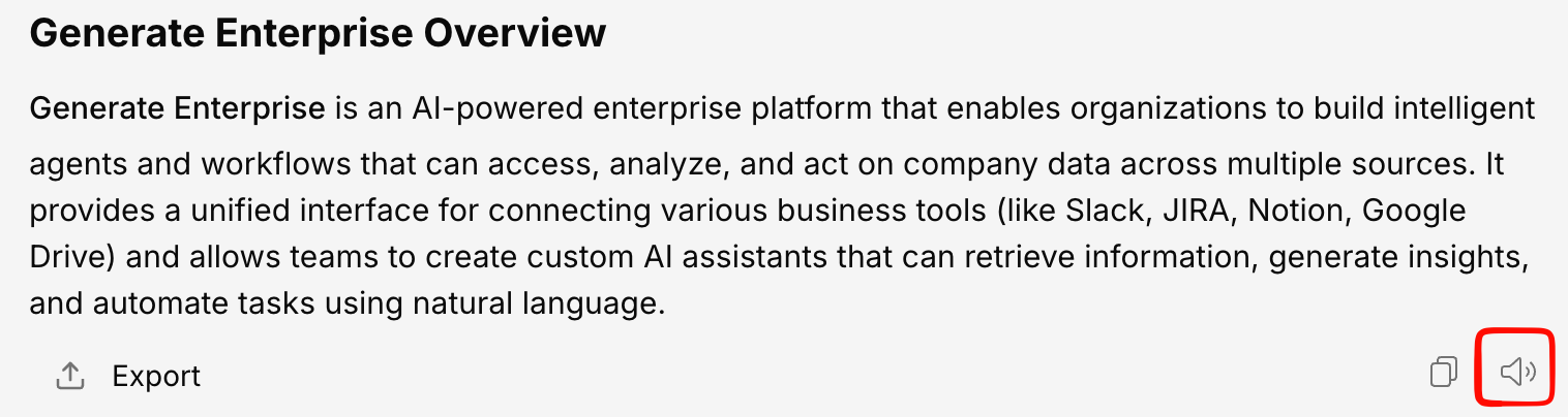 Click the speaker icon to have the AI response read out loud using text-to-speech. While reading:- A stop button appears to pause the reading
