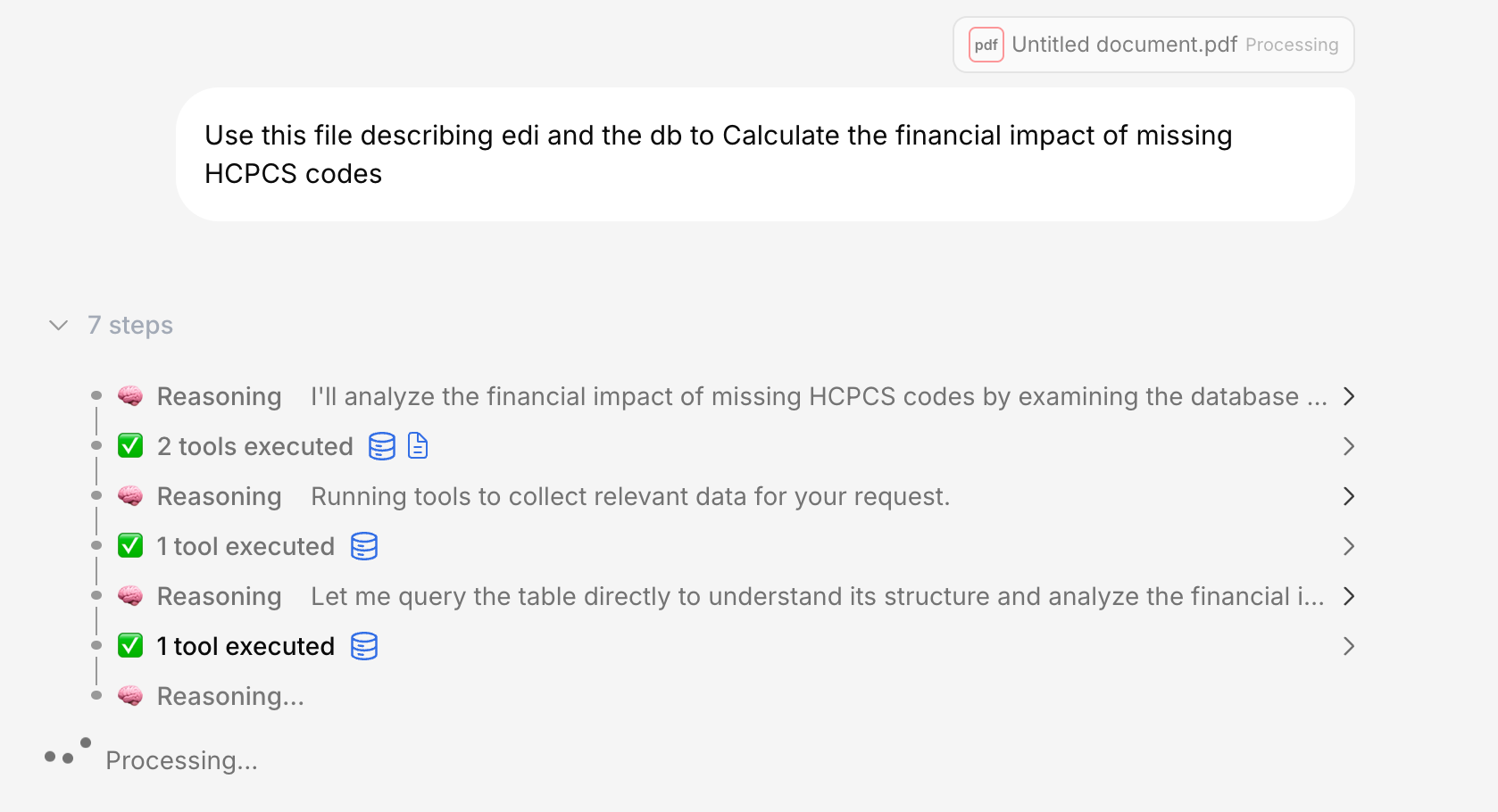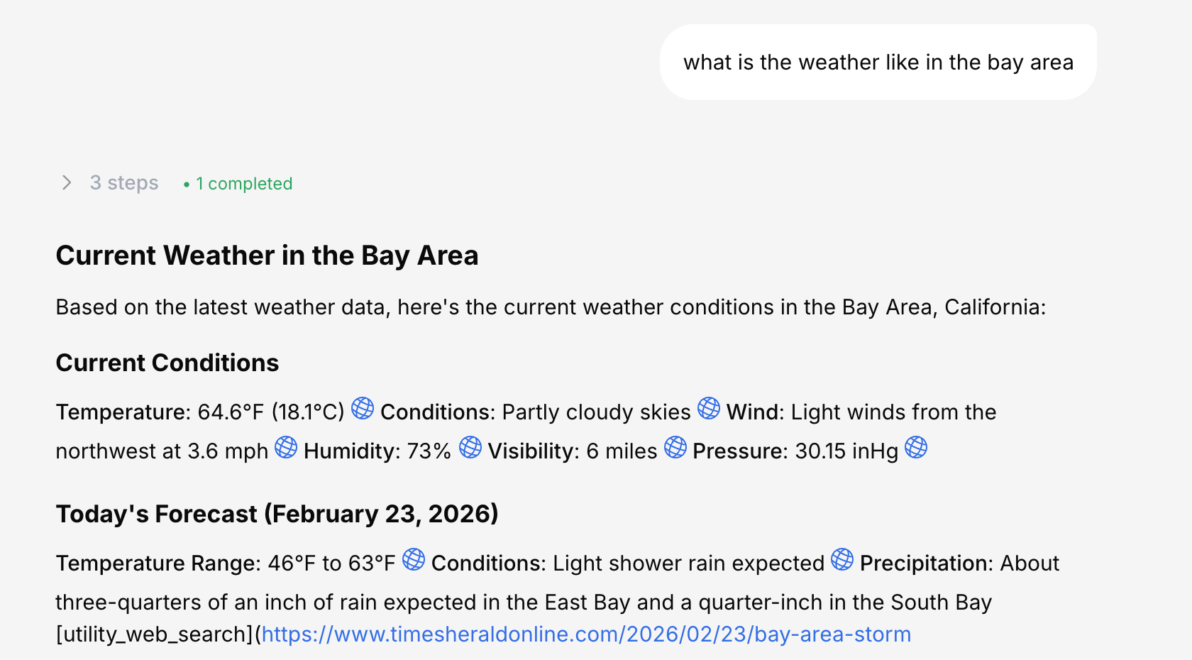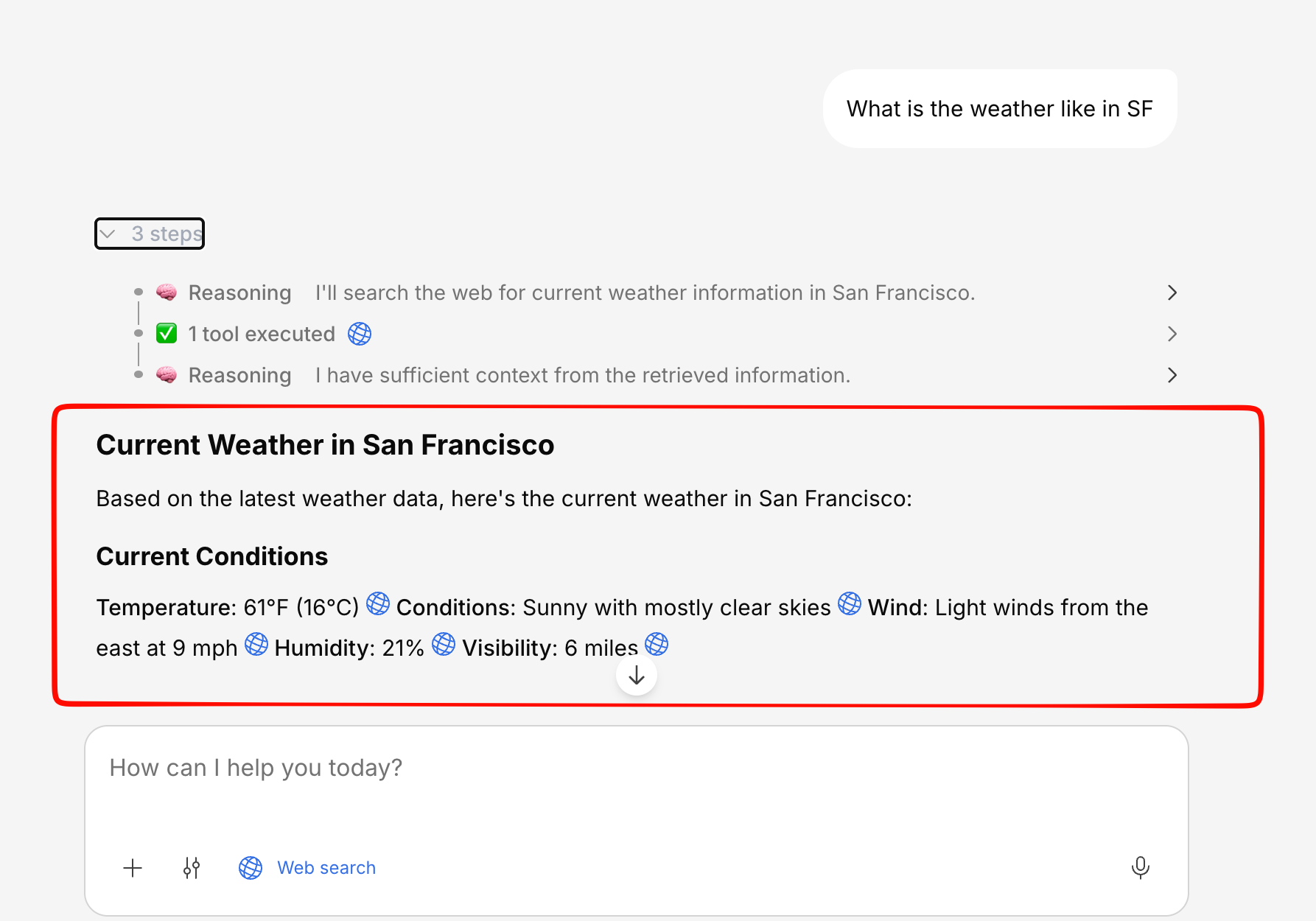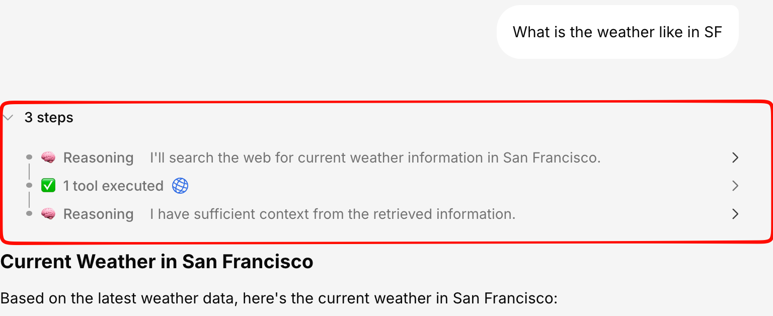 If the AI needs to search your knowledge base, query a database, or use a connector, you’ll see each step displayed in real-time.
