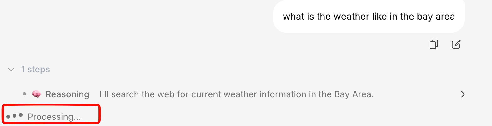 After you send a message, you’ll see several things happen in sequence:Tool execution (if needed)
