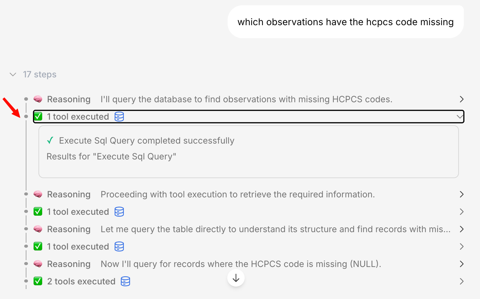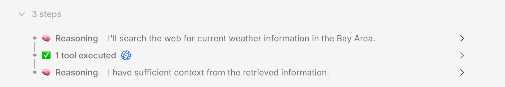 When the AI uses tools to answer your question, you’ll see a visual timeline of each step:| Status | What it means |