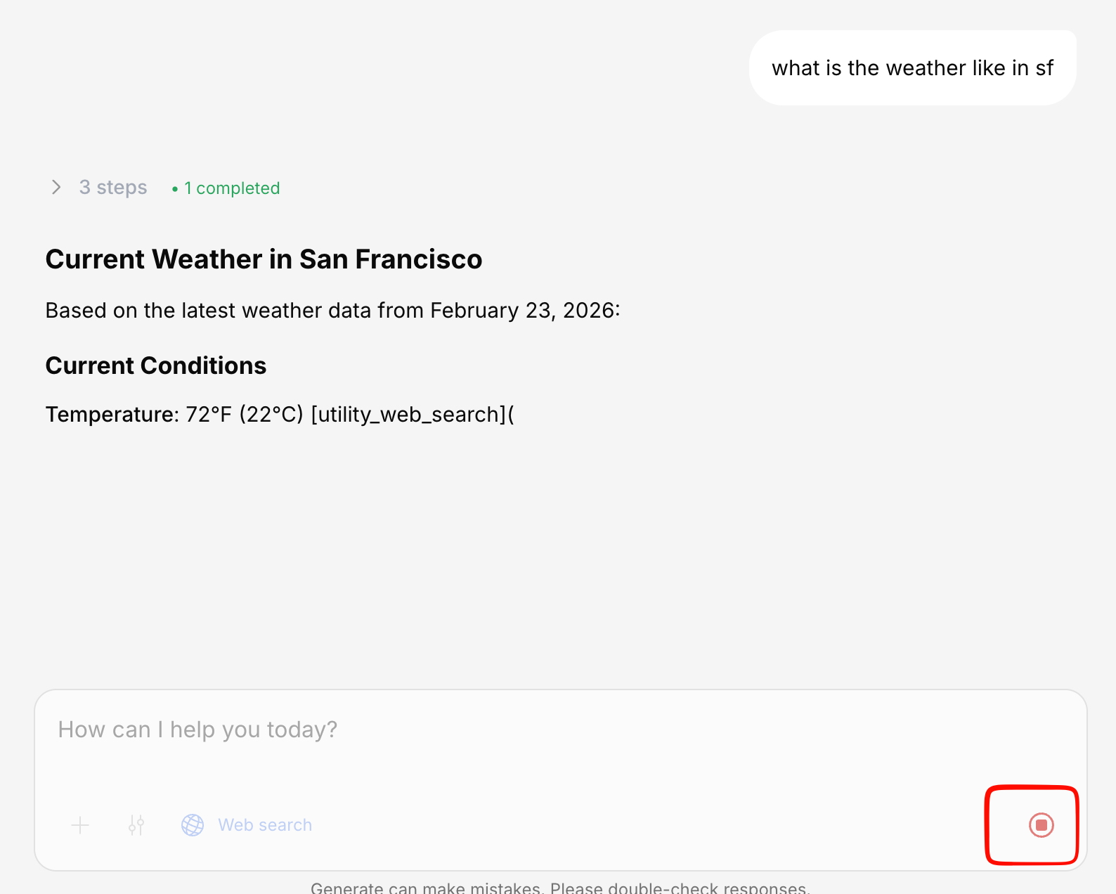 If you don’t need to wait for the full response, click the Stop button that appears during streaming.