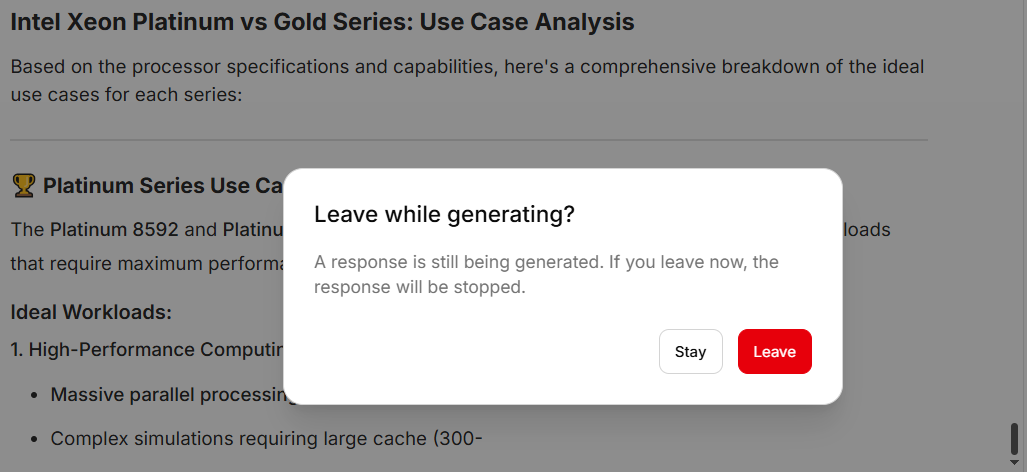 If you try to navigate away or close the tab while a response is being generated, you’ll see a confirmation dialog asking if you want to leave. If you confirm, the stream will stop automatically.