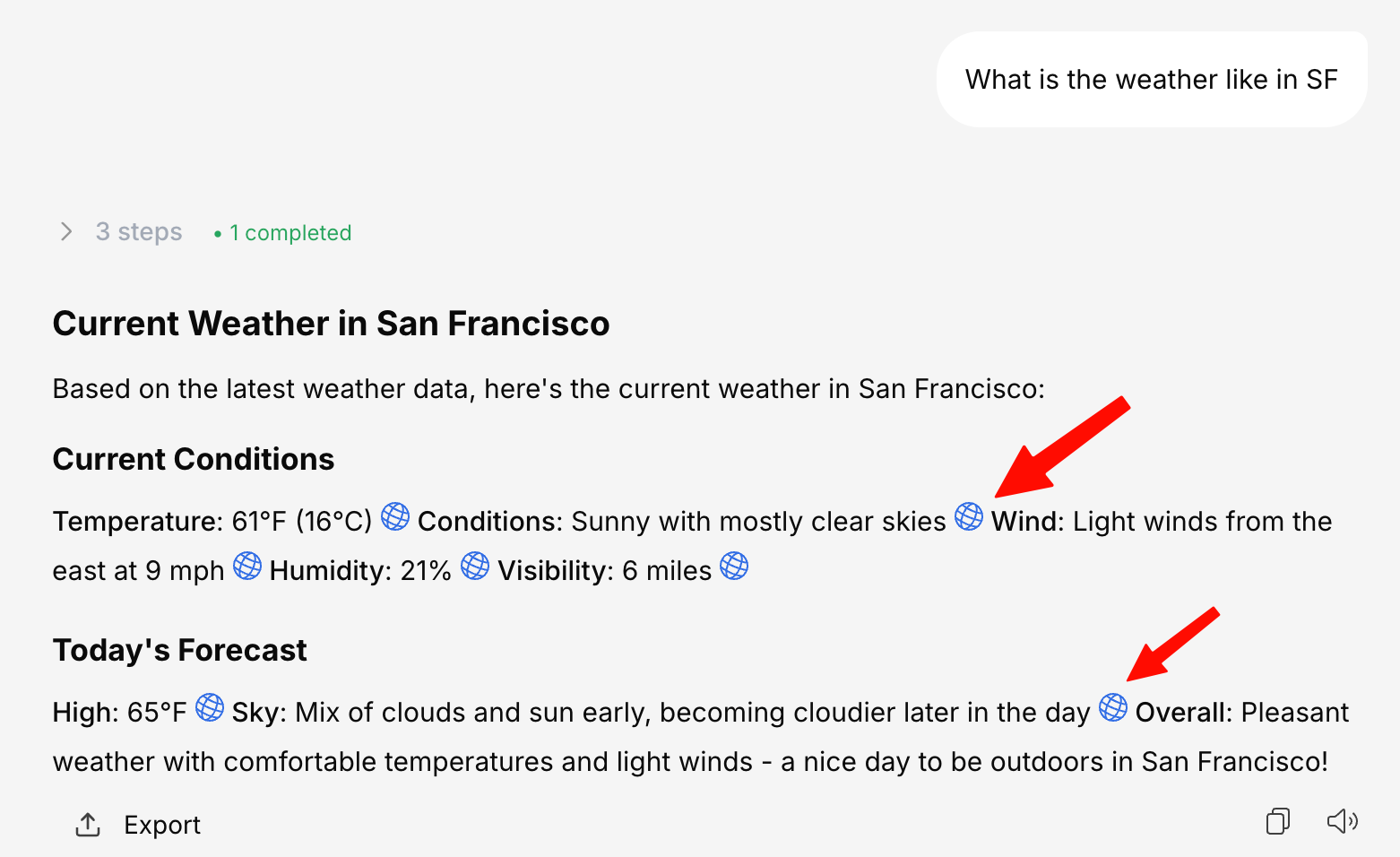 When web search is used, the response will clearly indicate which information came from:- Your knowledge base — Internal documents and data