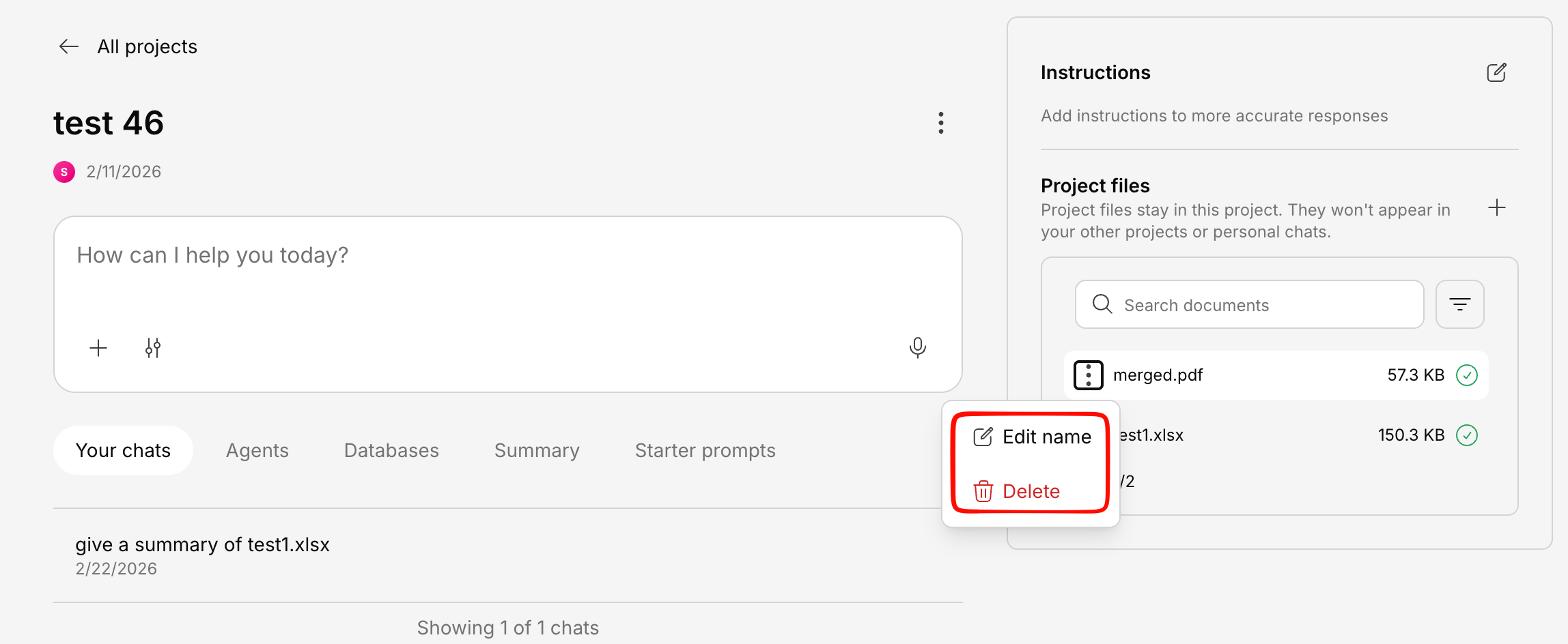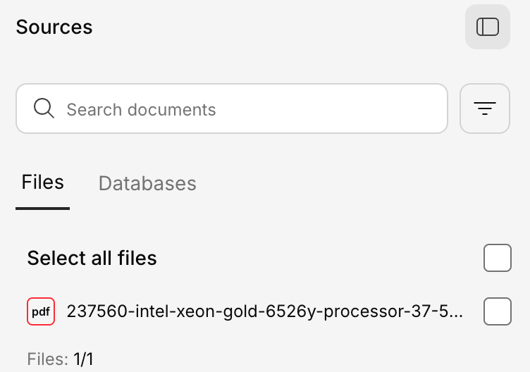 Open the Knowledge Base panel to see all uploaded documents. Each document shows:- File name and type