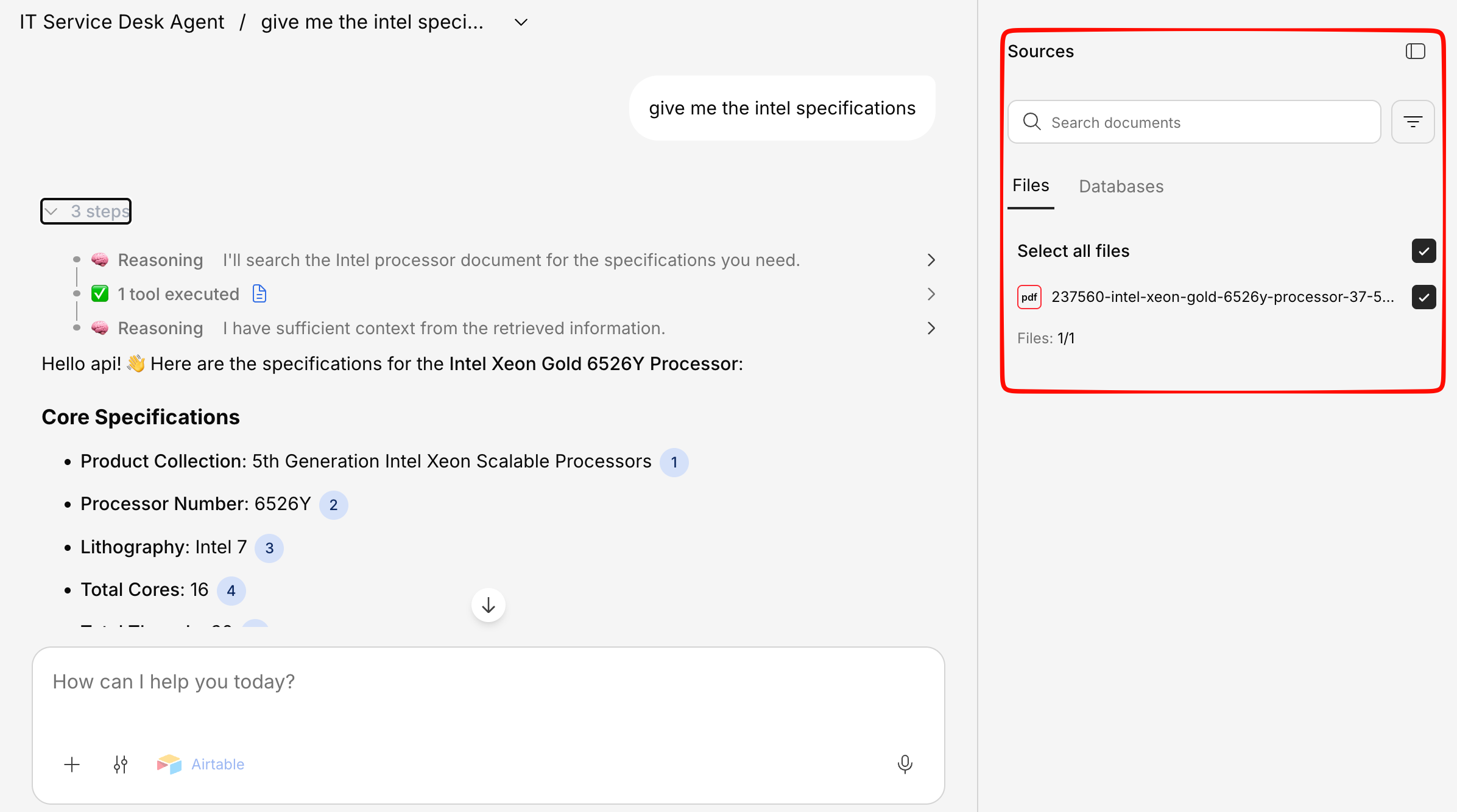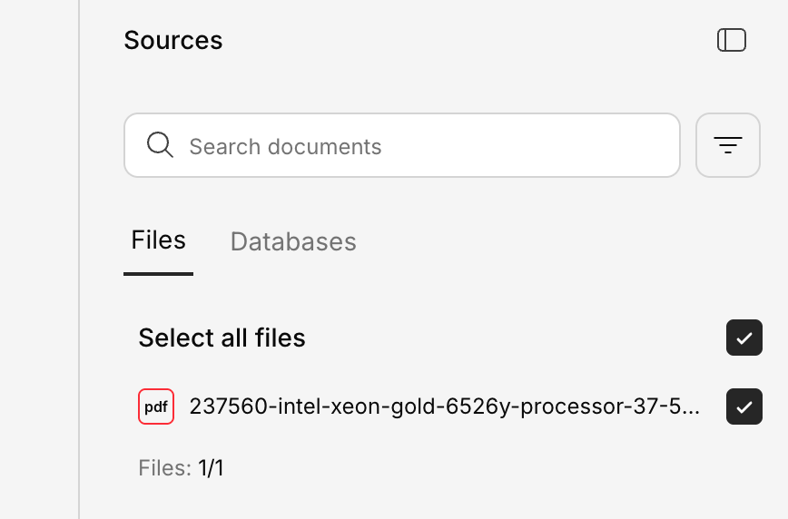 When you’re in a chat, you can open the Knowledge Base panel on the right side of the screen. It shows:- Documents used — Which files contributed to the current answer