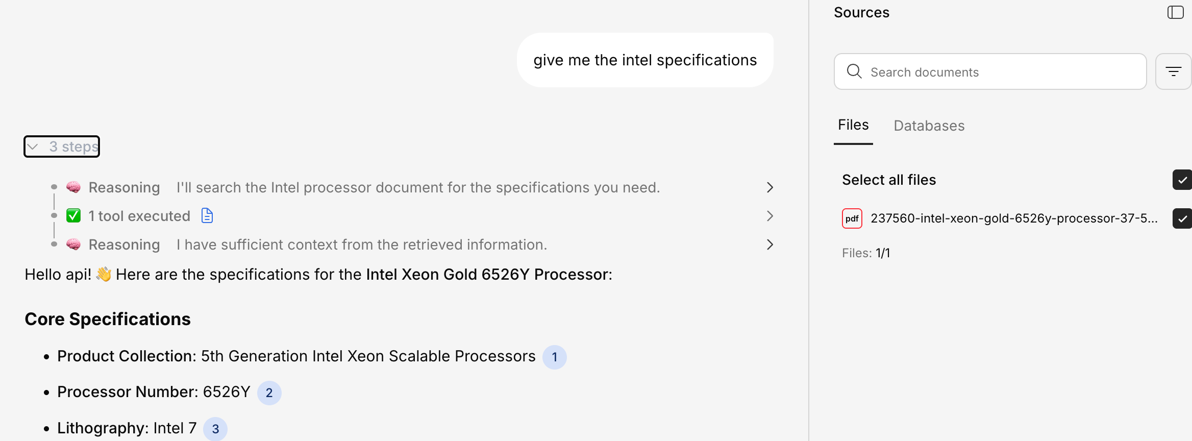 The platform finds the most relevant sections across all your uploaded documents.