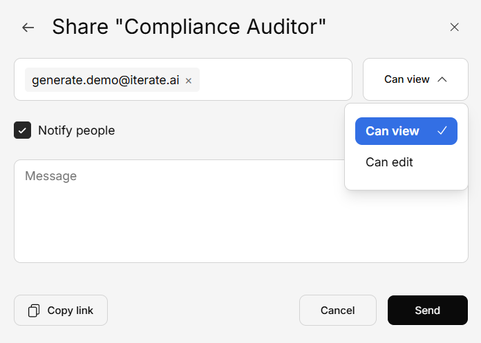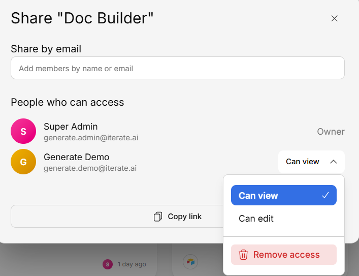 From the share modal, you can:- Change permissions — Upgrade a viewer to editor or downgrade