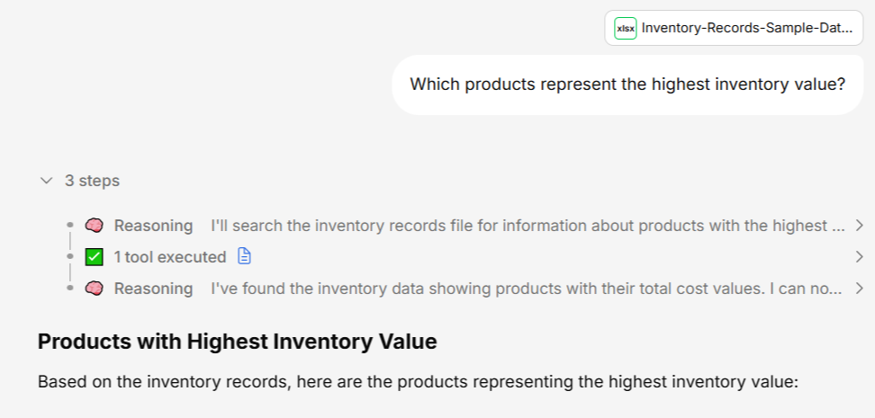 - Sources — References to the documents or data that the answer was drawn from, so you can verify and dig deeper