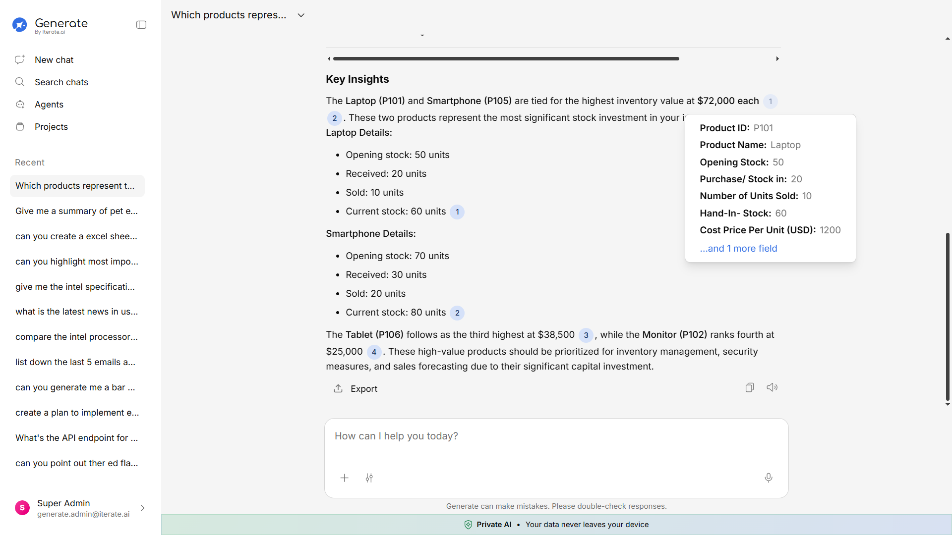 - Suggestions — Occasionally, Generate will suggest follow-up questions you might find useful