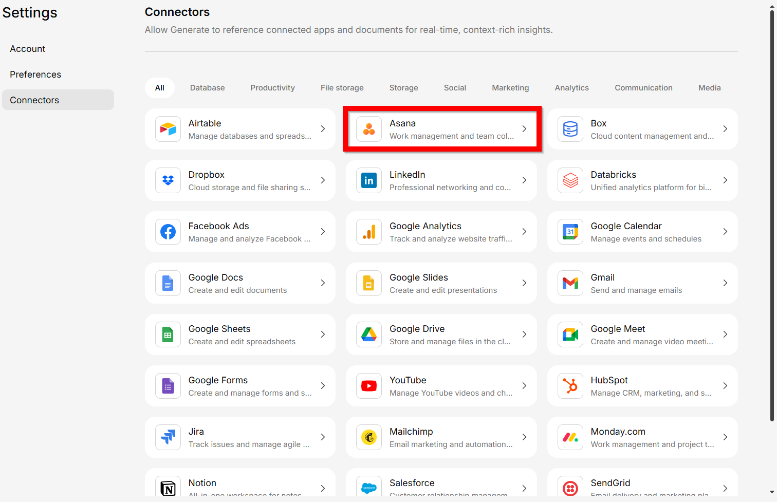 Connect Asana to access tasks, projects, and team workloads in Generate.