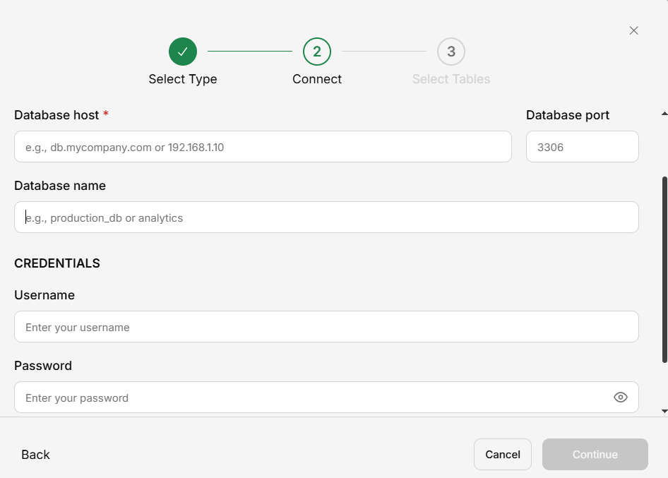 Provide your database connection information. Your administrator or IT team can provide these details.