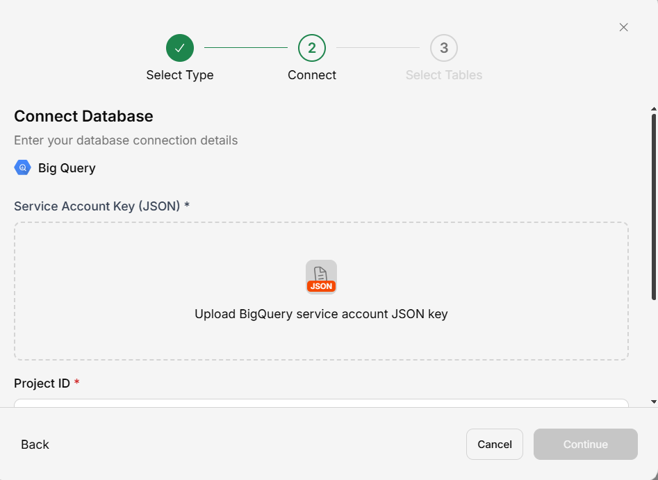 Enter your dataset ID, project ID and upload your service account key JSON file.