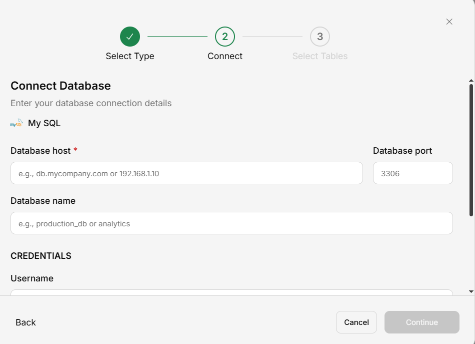 | Host | Your MySQL server address | db.example.com |
