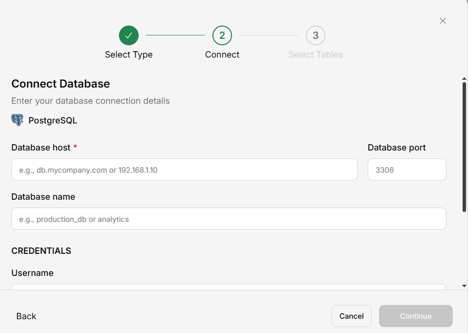 | Host | PostgreSQL server address | db.example.com |