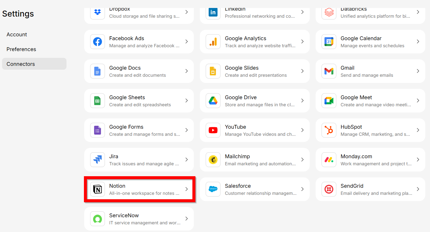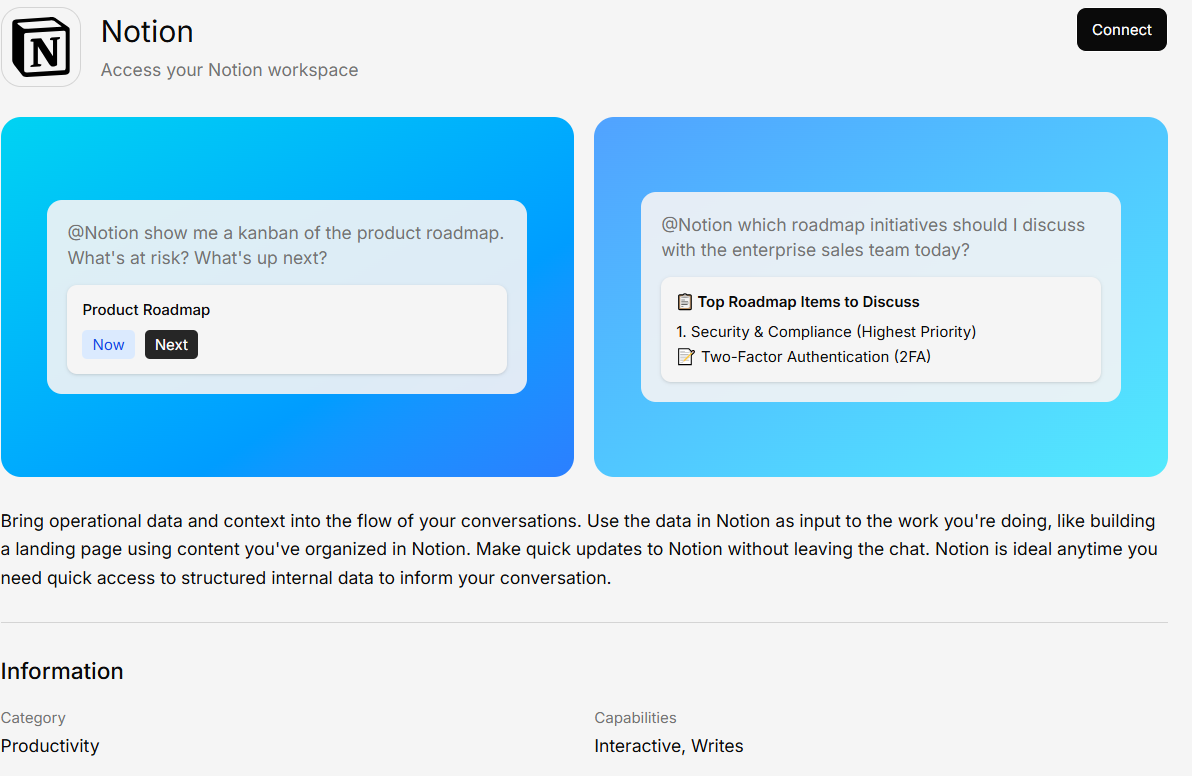 Connect Notion to access your workspace pages, databases, and wikis in Generate.