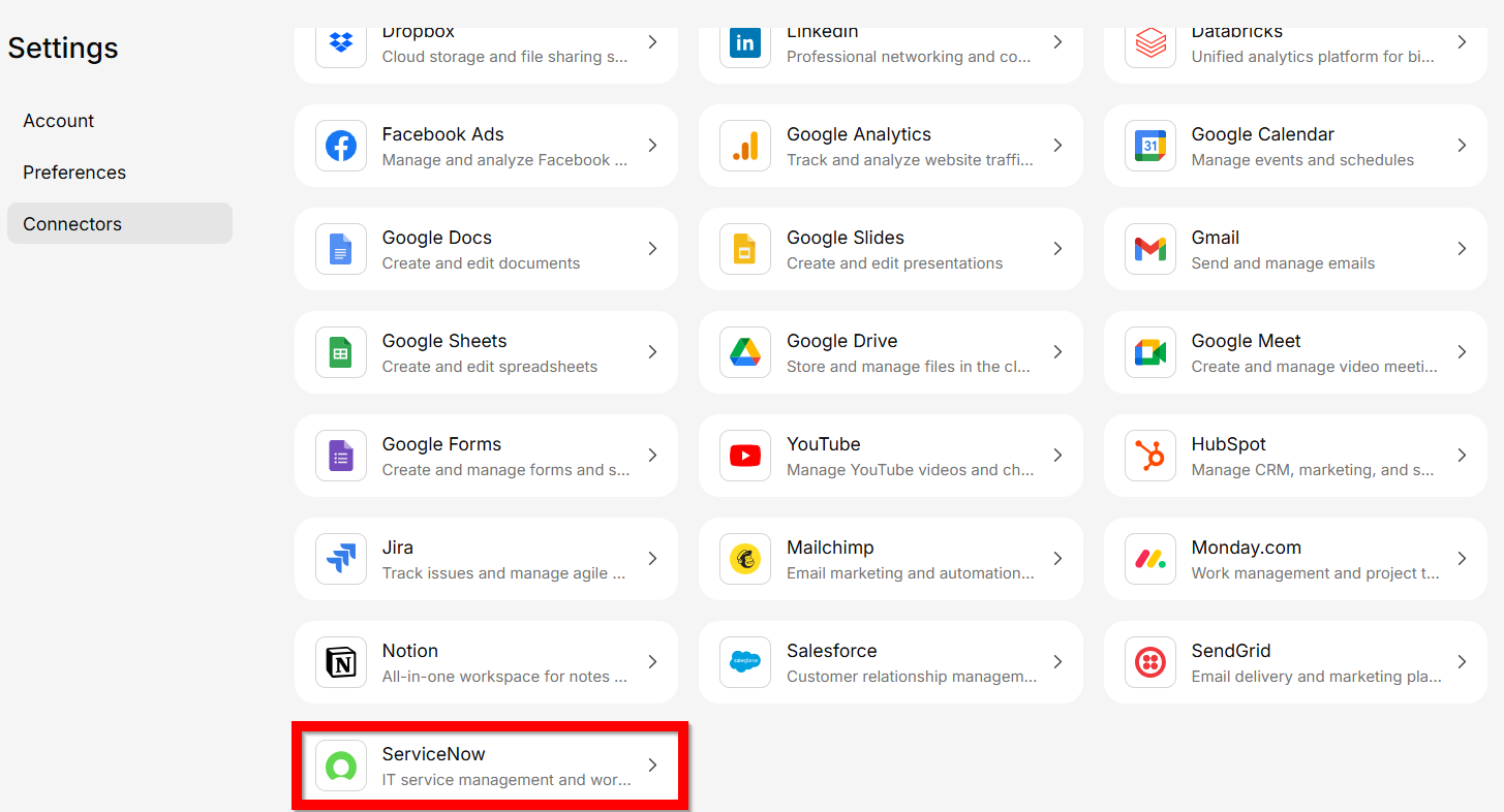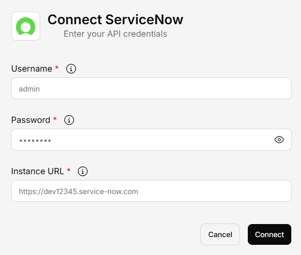 Connect ServiceNow to access IT service management data and tickets in Generate.