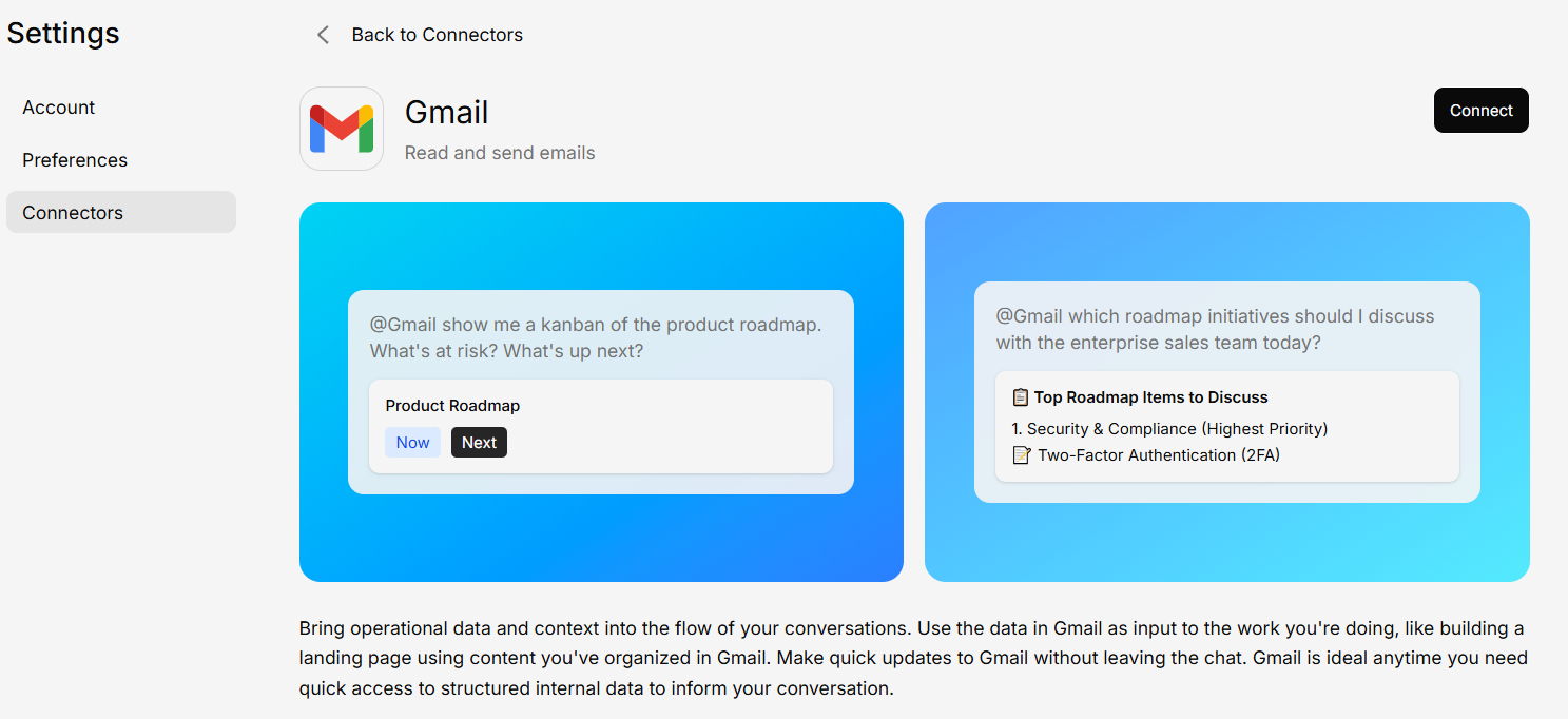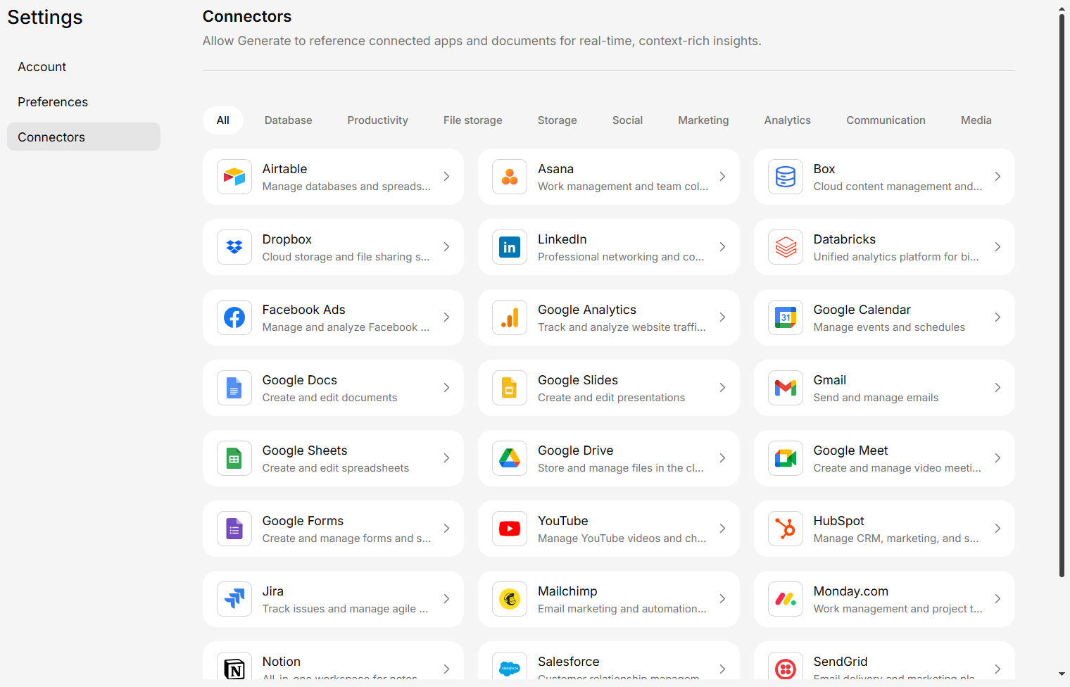 Some connectors may need to be enabled by your administrator before they appear in the connector list. If you don’t see a connector you need, reach out to your admin.