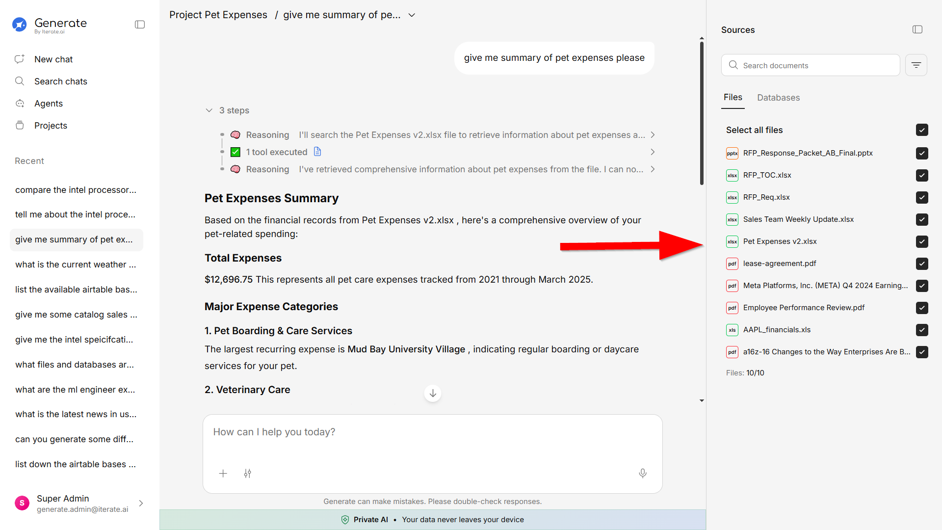 Upload your company’s documents and let Generate make them instantly searchable. It supports PDFs, Word documents, Excel spreadsheets, PowerPoint presentations, CSVs, and plain text files.