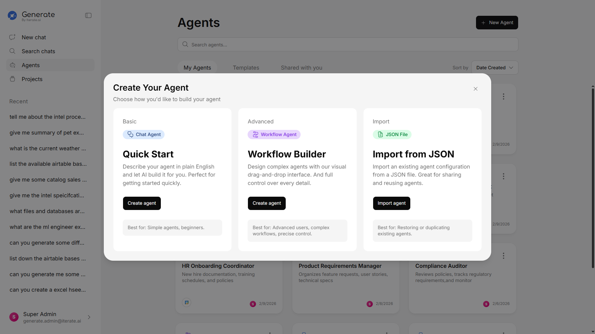 Create specialized AI assistants tailored to specific tasks. An agent can be set up with custom instructions, access to specific tools, and knowledge scoped to what it needs. Use the visual Agent Builder or Quick Mode for fast setup.