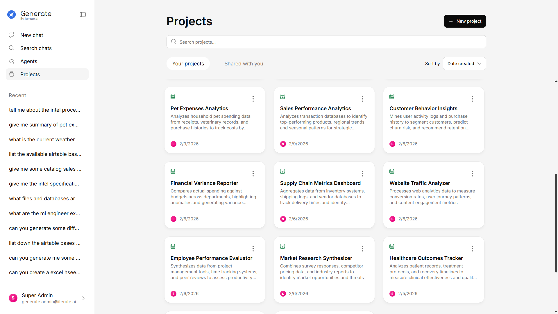 Organize your work into separate projects. Each project can have its own knowledge base, conversations, and configuration — perfect for separating work by department, client, or topic.