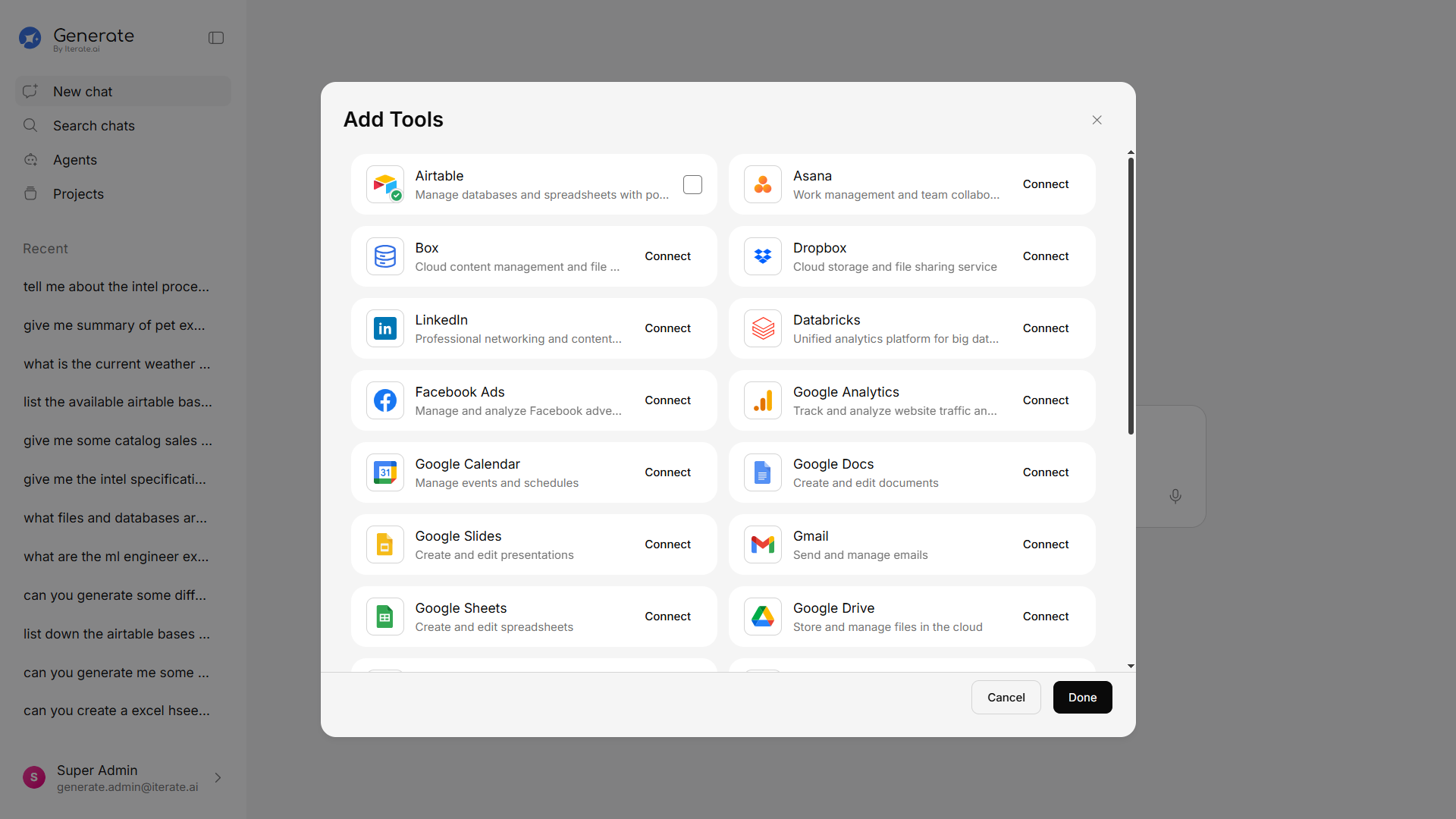 Connect Generate to the tools your team already uses. Pull data from Google Drive, Salesforce, Slack, Jira, Notion, HubSpot, Gmail, Dropbox, and many more — all without leaving the platform.